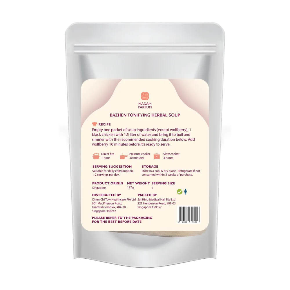Empty one packet of soup ingredients (except wolfberry), 1 black chicken with 1.5 liter of water and bring it to boil and simmer with the recommended cooking duration below. Add wolfberry 10minutes before it’s ready to serve.